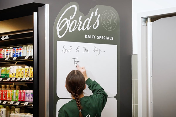 Gordon’s uses custom Dry Erase Decals to educate customers about daily specials and items-of-note. The decals allow them to update their daily offerings while keeping the branding consistent and the look polished.